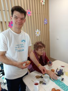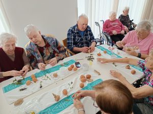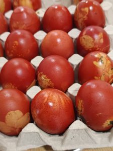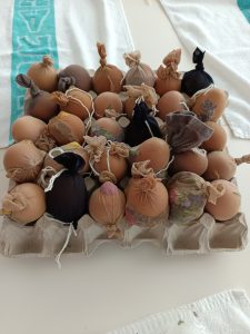 Velikonočna jajčka smo krasili po tradicionalnem postopku, z naravnimi rožicami in travicami, ovitimi v najlonke, ter jih skuhali v čebulnih olupkih. Nastajali so res čudoviti vzorci, še lepši pa so bili trenutki vmes. Ob vprašanju »a bo šlo«, je hitro prišel nasmejan odgovor: »Ah, kaj ne bi šlo, koliko takih sem že naredila v življenju!«
